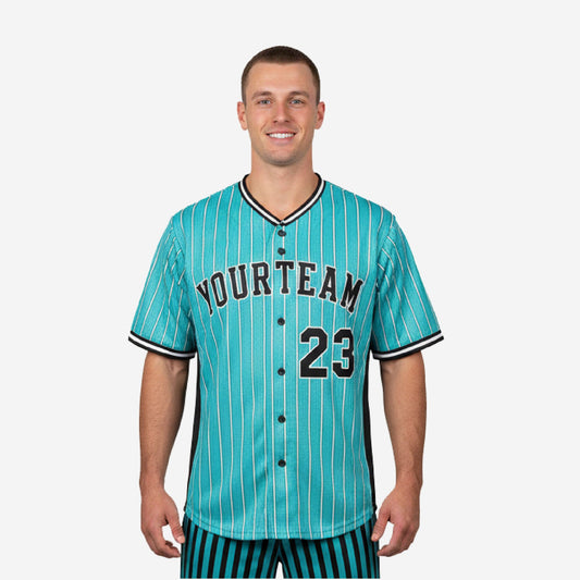 Custom Baseball Uniform Jersey - Pinstripe Full Button Sublimated Jersey in Teal Blue