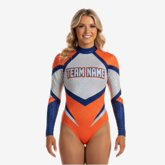 Custom Cheerleading Bodysuit - Orange Navy Silver Sparkle Long Sleeve Uniform