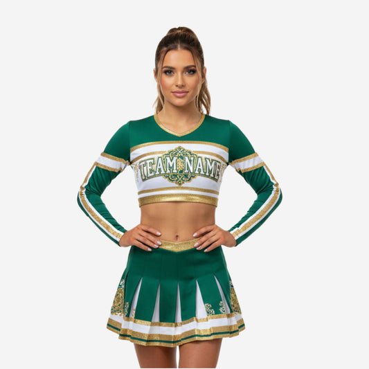 Custom Cheerleading Uniform Set in Green - Long Sleeve Crop Top & Skirt Set