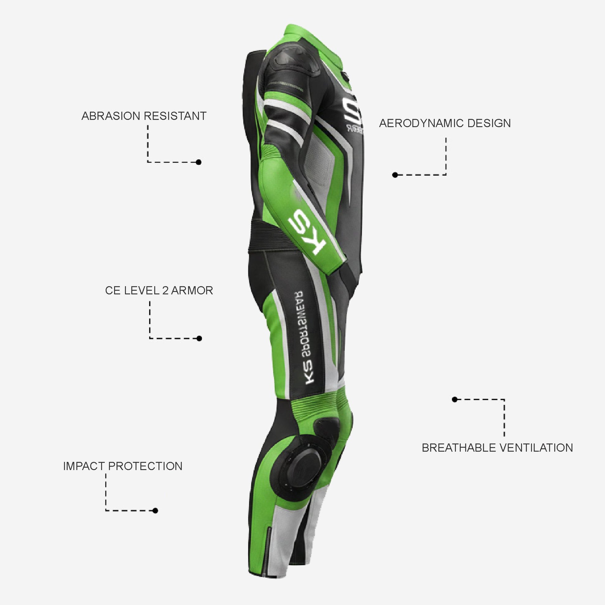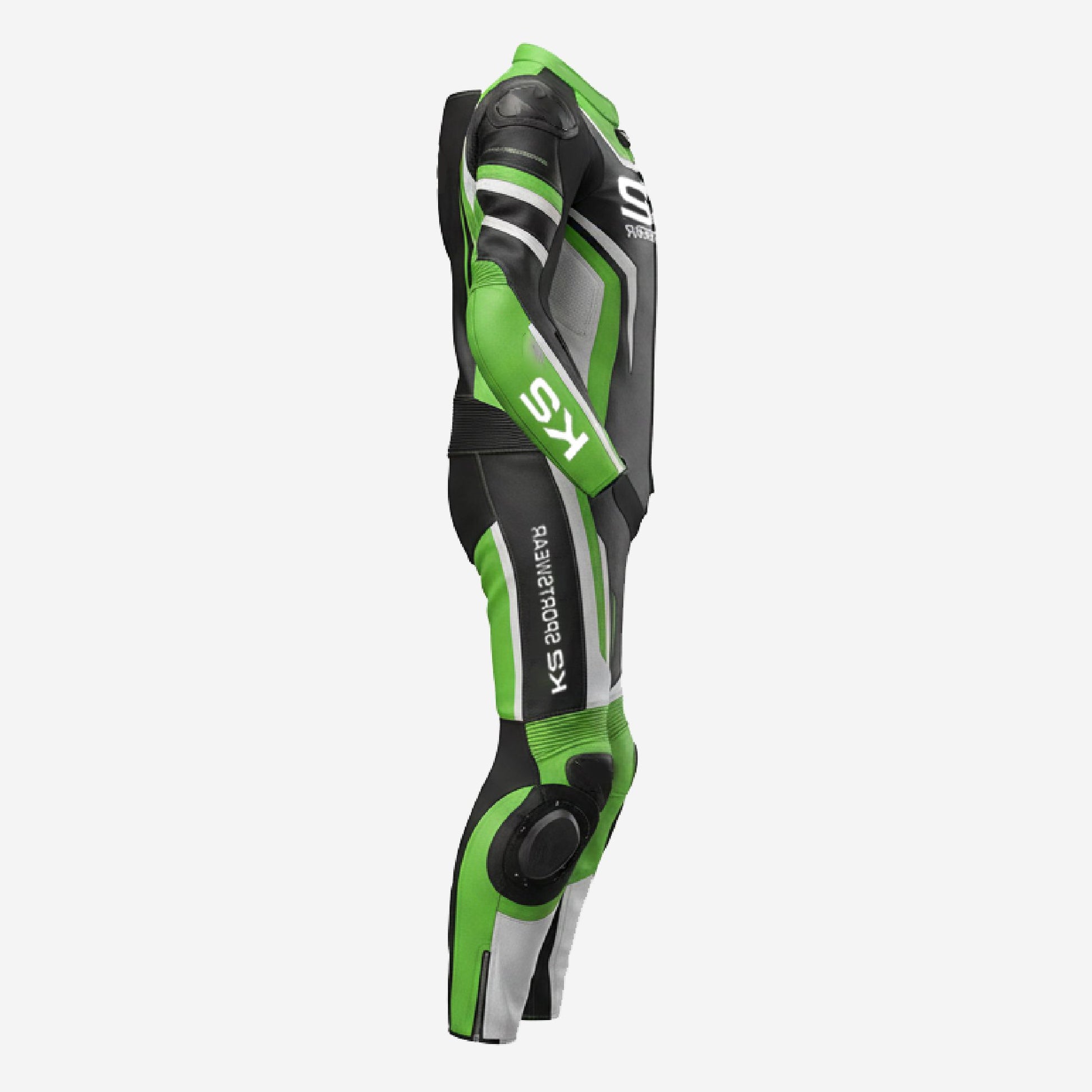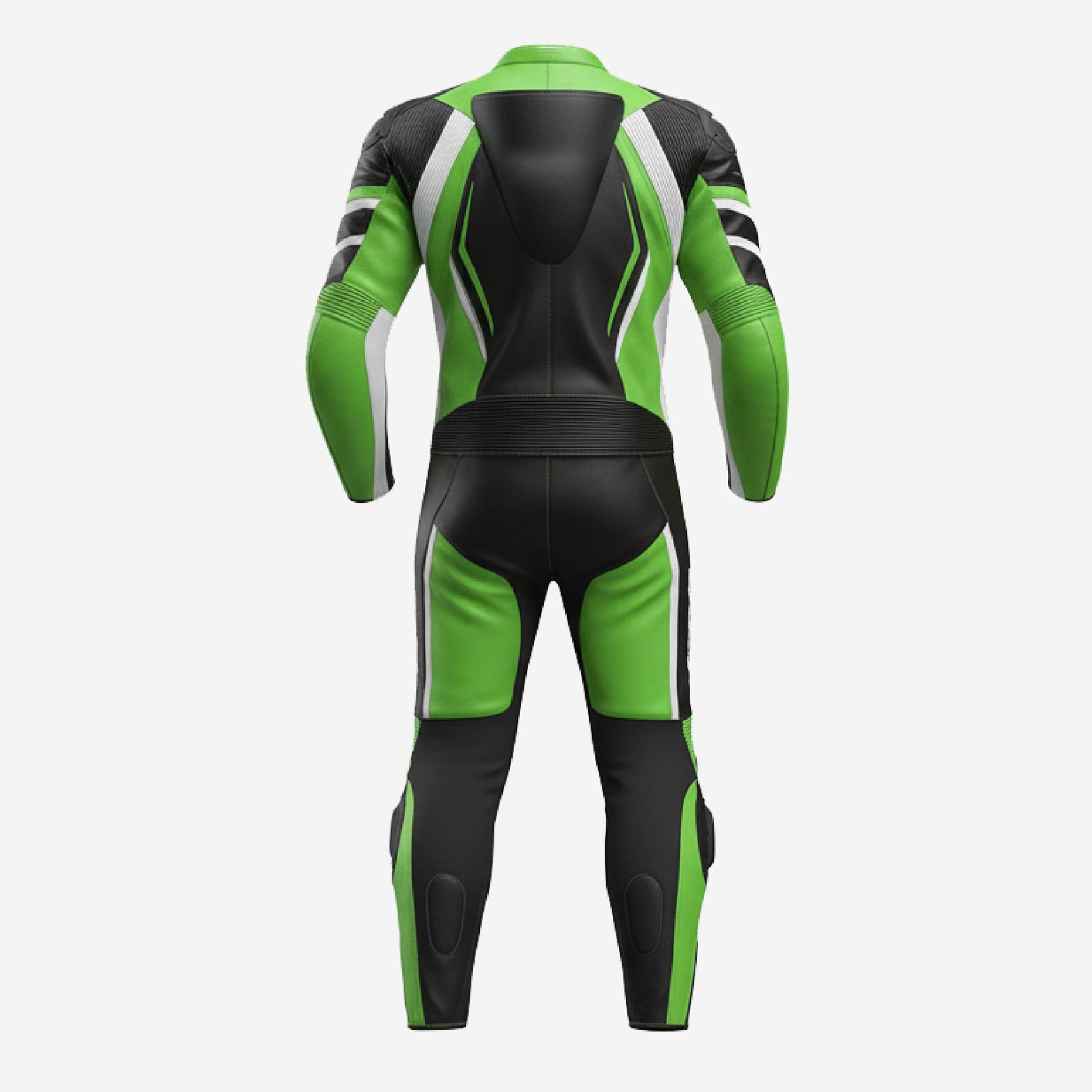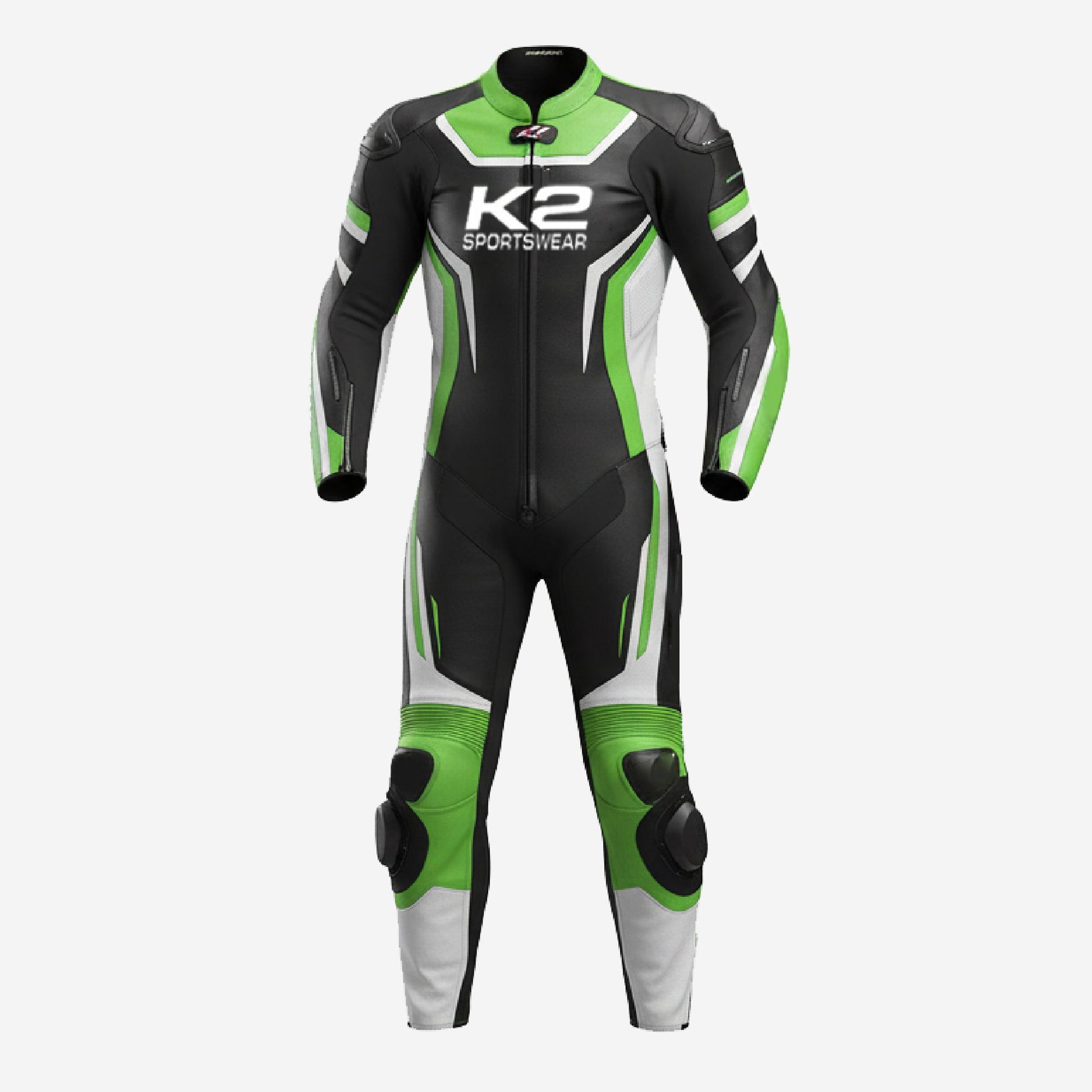 Custom Motorcycle One Piece Suit in Green & Black - Leather Racing Suit with CE Armor