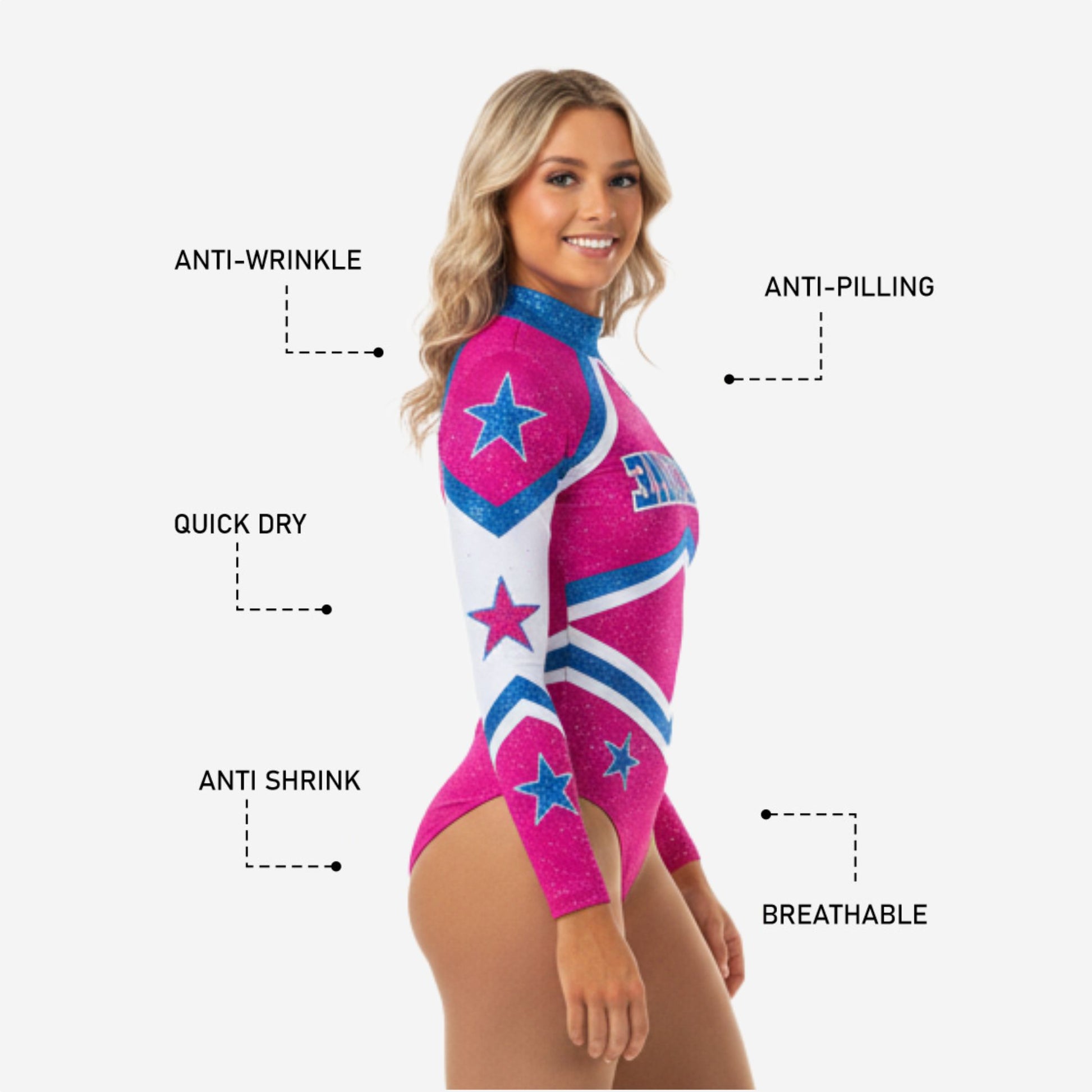 The long sleeves provide coverage and light compression support during tumbling, while four-way stretch fabric moves effortlessly with every motion. Moisture-wicking technology keeps athletes dry during intense routines, and the breathable construction prevents overheating. Pair this bodysuit with our custom cheerleading skirts or athletic shorts for complete uniform sets that turn heads.
